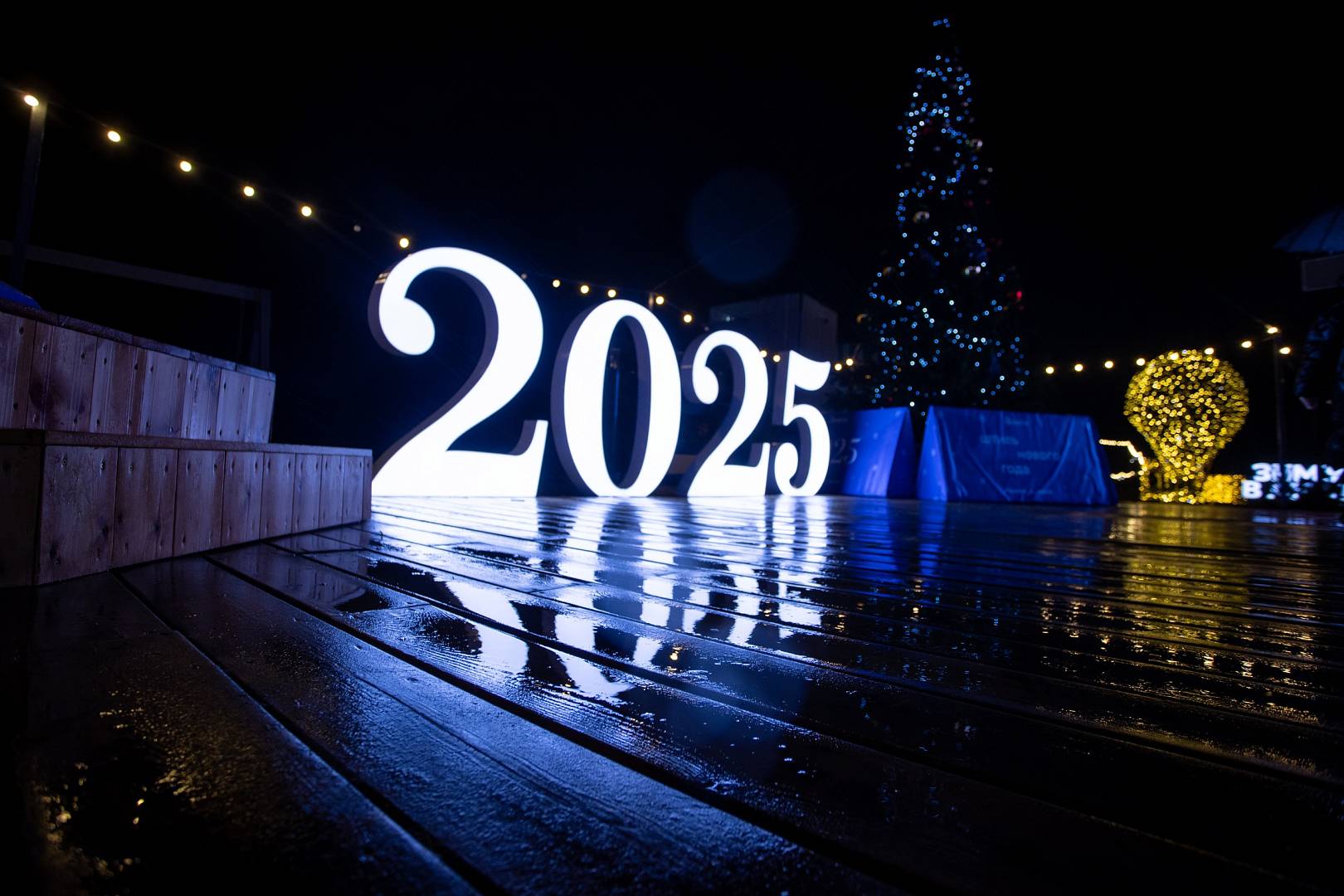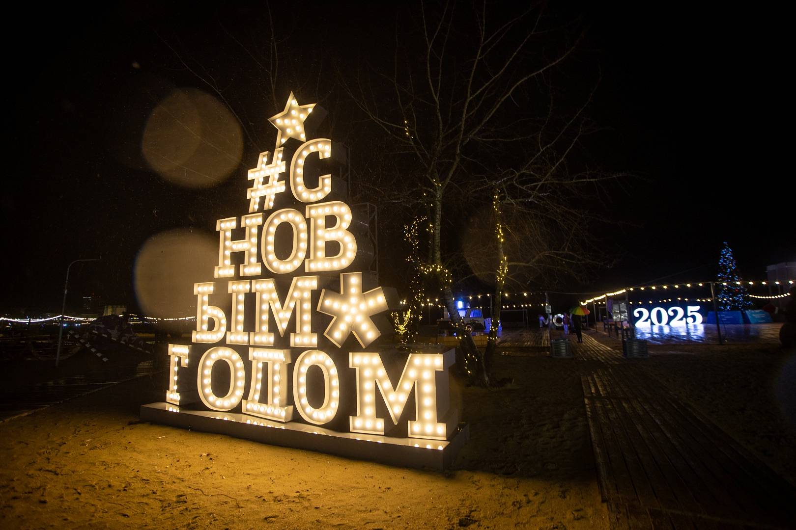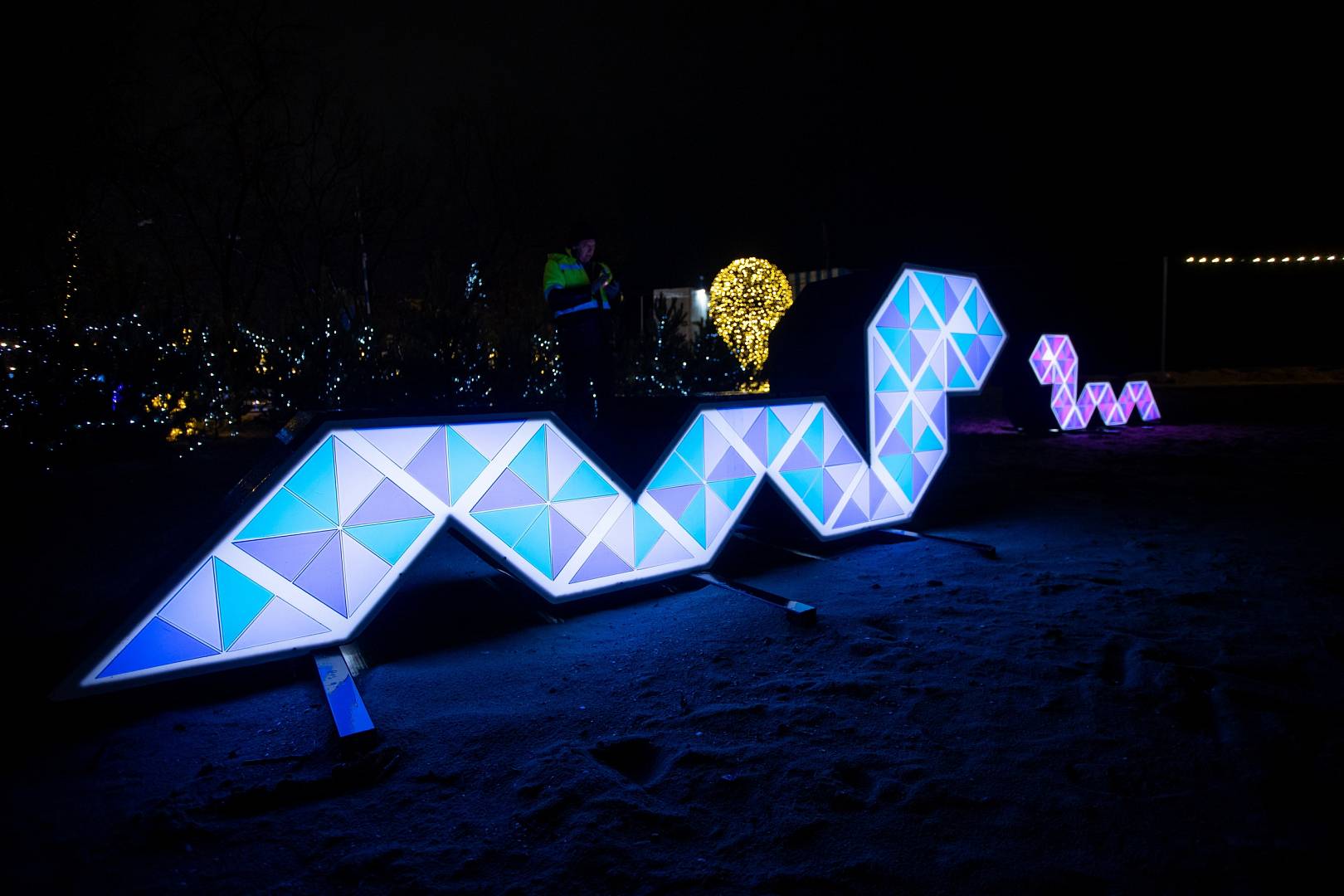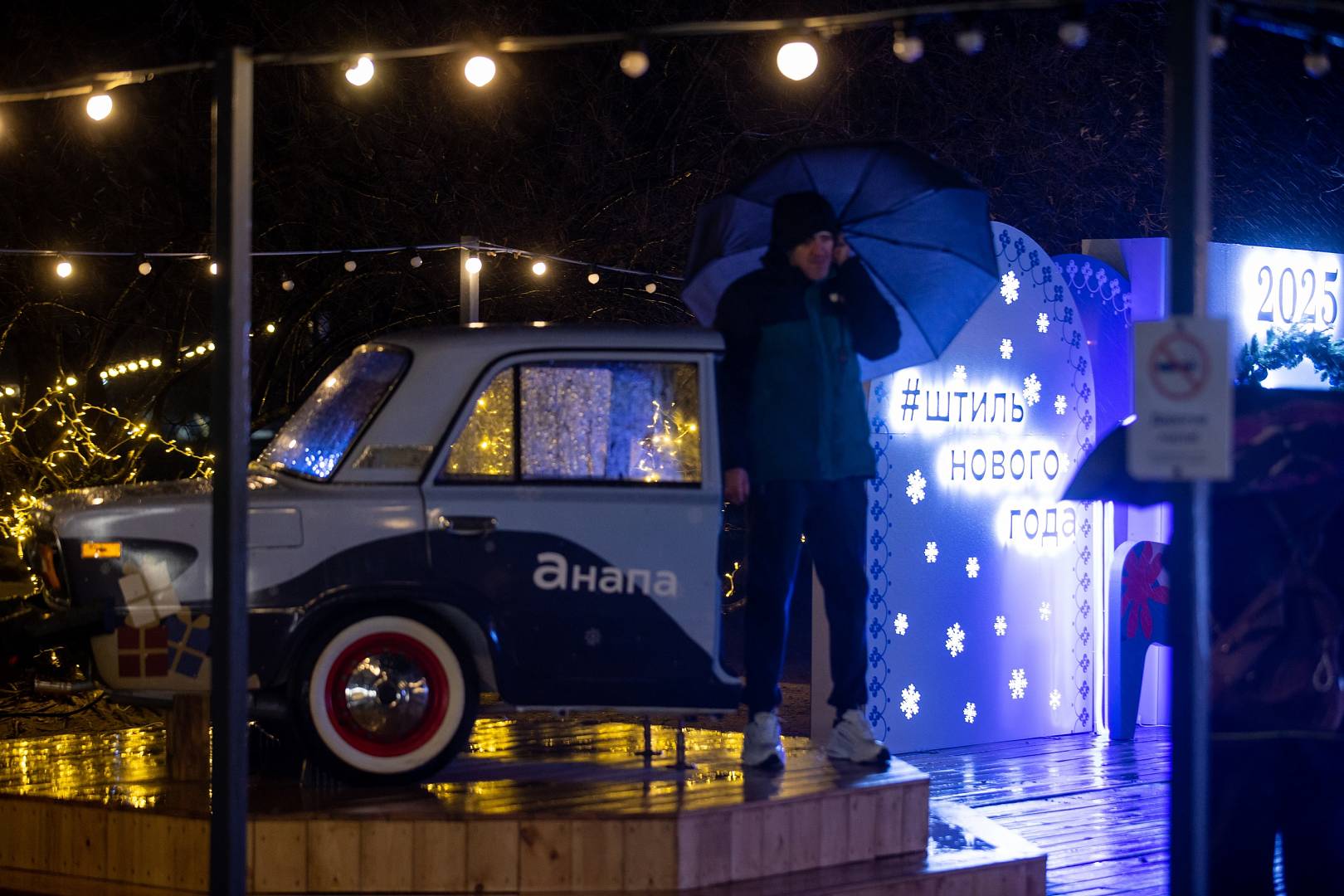 На подиуме установлена фигура змеи – символа наступающего года. Создана масштабная зона в тематике «Родные мотивы» со стильными фотозонами с матрешками, сказочными персонажами, световыми фигурами и другими арт-объектами.
