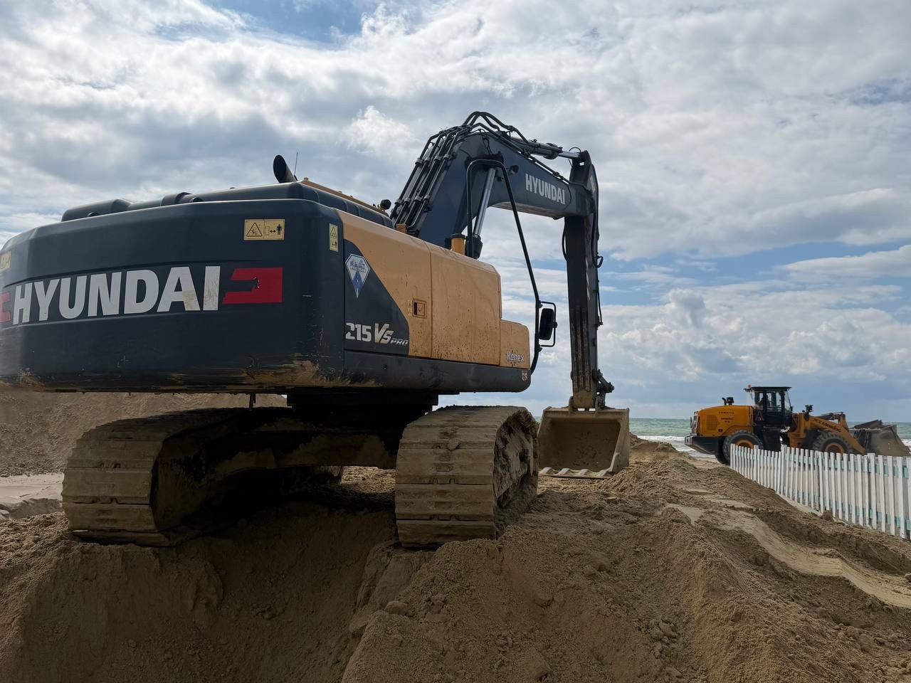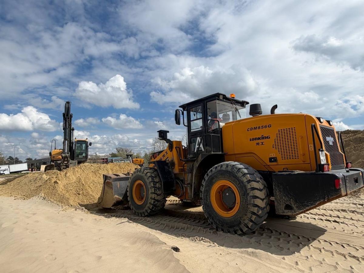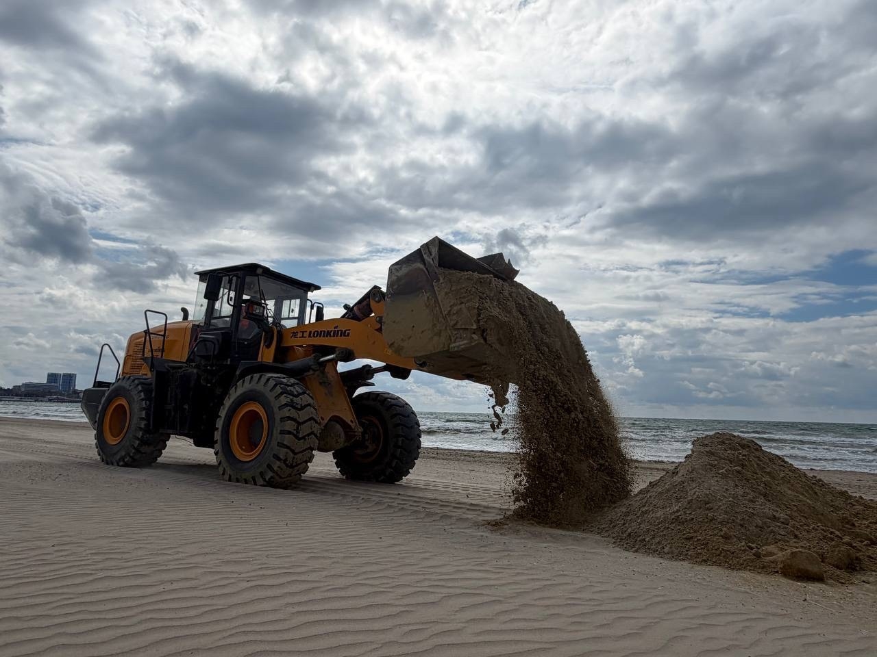 Сейчас действует один технологический заезд для техники в районе «Гранд-Отеля», идет подготовка еще двух. На пляже работают погрузчики, бульдозеры и экскаватор. При увеличении объема завозимого песка количество спецтехники также будет увеличено.