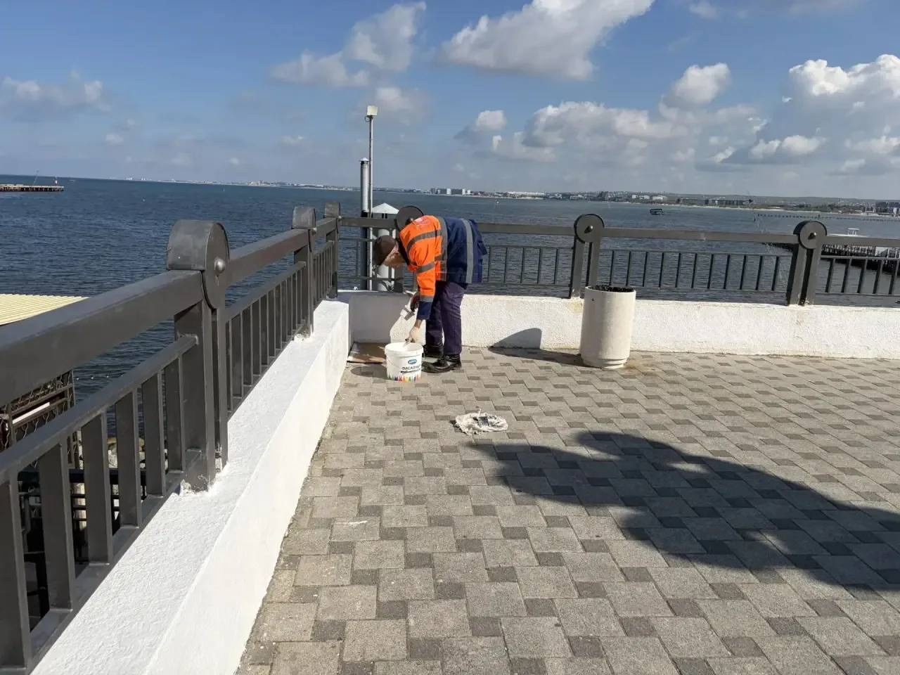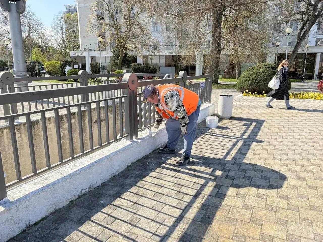 На набережной продолжается покраска ограждений и побелка бордюров – приводим в порядок одну из главных прогулочных зон города.