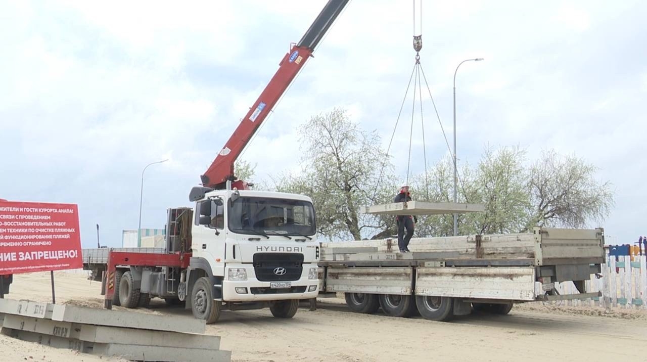 – Сейчас идут подготовительные работы – процесс укладки первых плит, далее будет выстраиваться технологическая дорога для того, чтобы самосвалы могли проезжать. Всего будет 4 этапа общей протяженностью 12 км. Первый этап работ начинается от центрального пляжа и завершается участком «Бимлюк». Его протяженность 3,5 км.